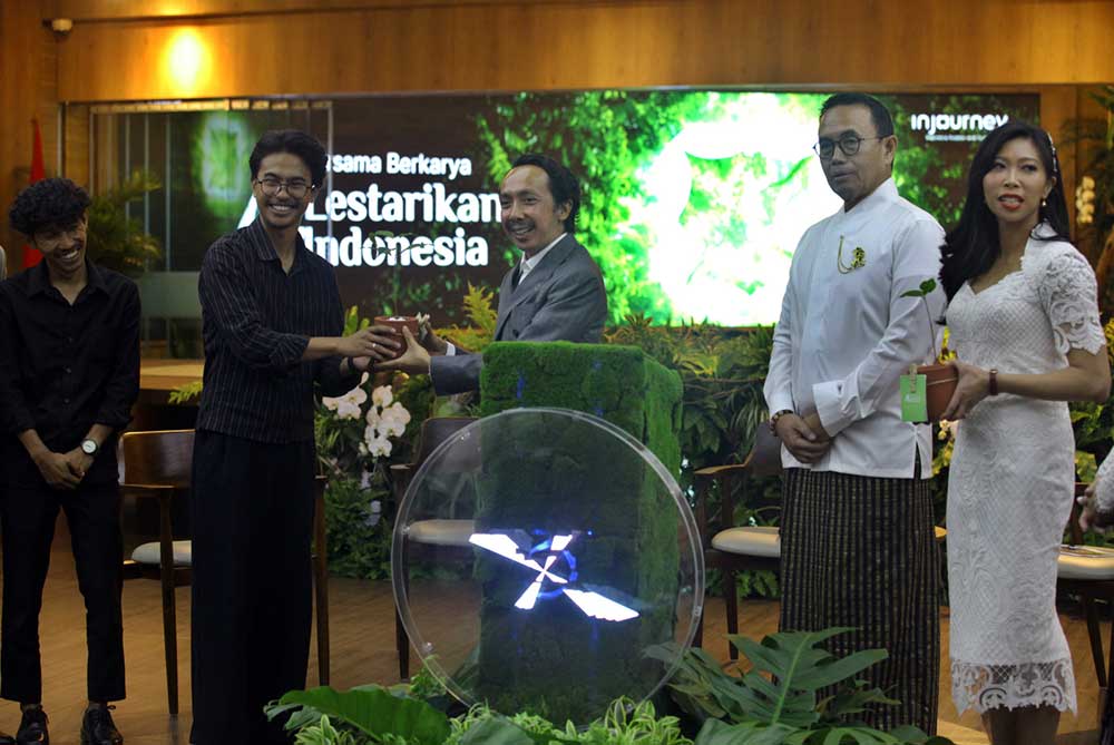 Komisaris Utama InJourney Iwan Setyawan (tengah) didampingi Direktur Utama Maya Watono (kanan), Direktur SDM dan Digital Herdy Harman (kedua kanan) menyerahkan bibit tanaman kepada relawan Pandawara Group disela Press Conference 4 Tahun InJourney di Jakarta, Senin (19/1). PT. Aviasi Pariwisata Indonesia atau InJourney memiliki visi besar mengintegrasikan ekosistem aviasi dan pariwisata Indonesia menjadi satu kekuatan dengan tagline 4 Tahun InJourney: Bersama Berkarya, Lestarikan Indonesia.Foto/RoniMawardi/BUMNTRACK