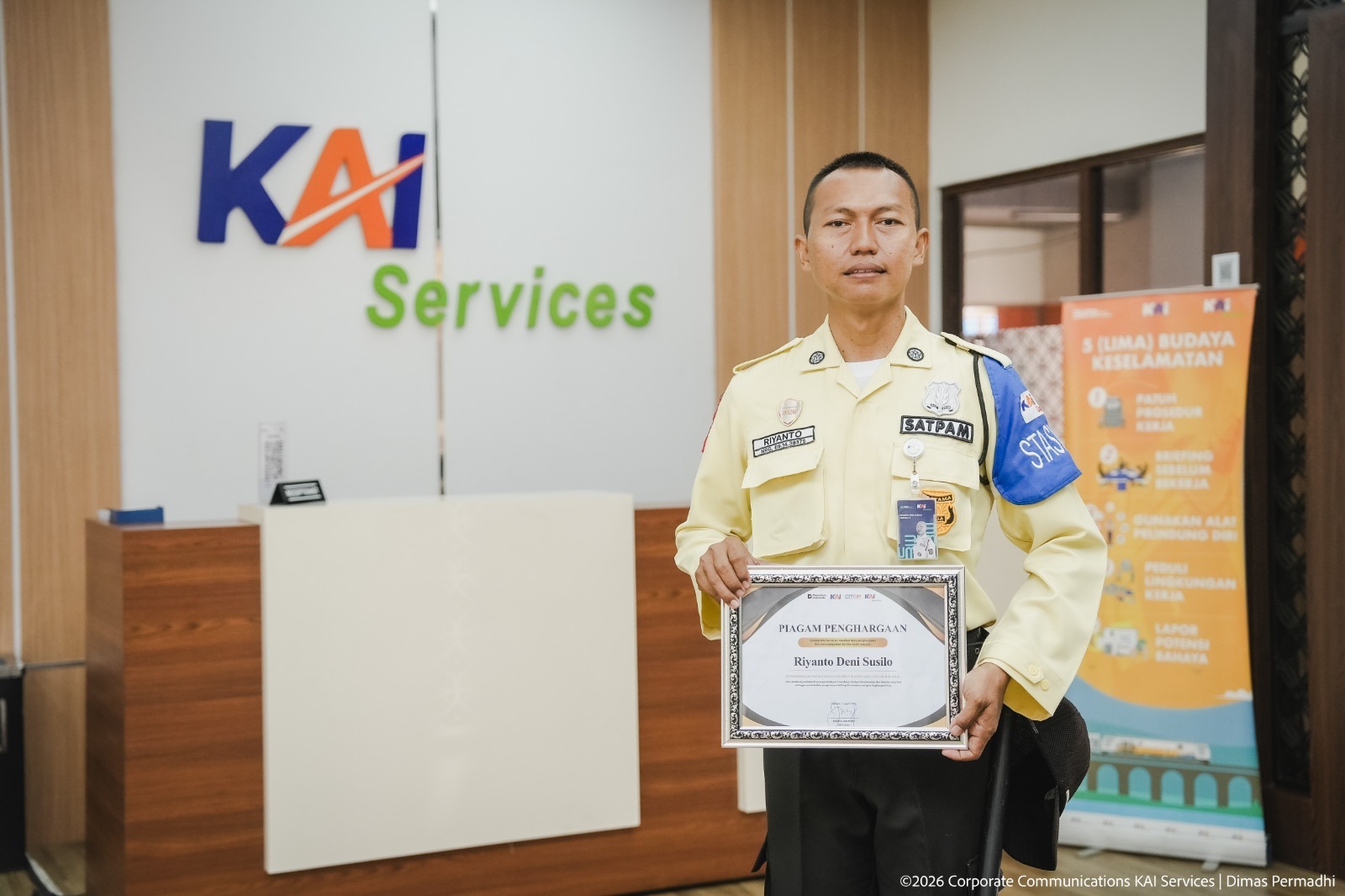 Bertempat di Auditorium, Kantor Pusat KAI Services pada Selasa (14/4) KAI Services memberikan piagam penghargaan kepada Riyanto Deni Susilo, petugas satuan keamanan yang sehari-hari bertugas di Stasiun Manggarai, Jakarta.