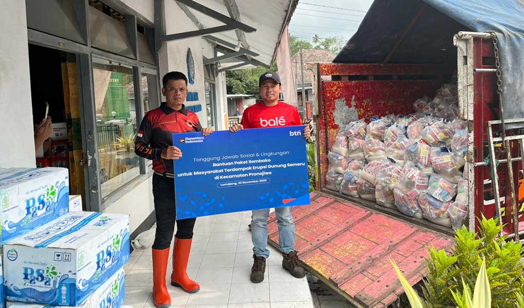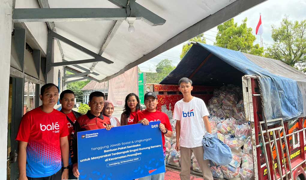 Wakil Kepala Cabang Pembantu Lumajang PT Bank Tabungan Negara (Persero) Tbk, Ramadhan Aryo Hutama, menyerahkan bantuan paket sembako kepada Kepala Kecamatan Pronojiwo, Hani Pujianto, untuk warga terdampak erupsi Gunung Semeru di Kecamatan Pronojiwo, Kabupaten Lumajang, Provinsi Jawa Timur, Jumat (22/11). Bantuan ini merupakan bagian dari program Tanggung Jawab Sosial & Lingkungan (TJSL) BTN sebagai wujud kepedulian dan dukungan bagi masyarakat yang tengah menghadapi dampak erupsi dan pemulihan kondisi di wilayah tersebut.Foto/Dok-BTN/BUMNTRACK