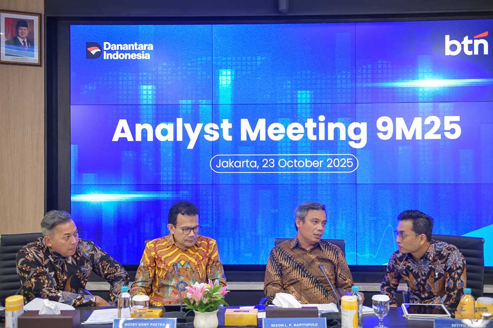 Direktur Utama PT Bank Tabungan Negara (Persero) Tbk Nixon LP Napitupulu (ketiga kiri) didampingi Direktur Network & Retail Funding BTN Rully Setiawan (kiri), Direktur Finance & Strategy BTN Nofry Rony Poetra (kedua kiri), Direktur Risk Management BTN Setiyo Wibowo (kedua kanan), dan SEVP Digital Business BTN Thomas Wahyudi (kanan) tersenyum melihat kinerja BTN per 30 September 2025 di Jakarta, Kamis (23/10). Pada kuartal III/2025, BTN berhasil membukukan laba bersih sebesar Rp2,3 triliun, bertumbuh double-digit sebesar 10,6% secara tahunan (yoy) dibandingkan periode yang sama tahun lalu sebesar Rp2,08 triliun. Kredit dan pembiayaan BTN pun tercatat tumbuh positif sebesar 7,0% yoy menjadi Rp381,03 triliun hingga kuartal III/2025. Meningkatnya kepercayaan masyarakat bertransaksi lewat BTN juga mendongkrak pertumbuhan DPK yang mencapai 16,0% yoy hingga kuartal III/2025, menjadi Rp429,92 triliun, dari posisi yang sama tahun lalu sebesar Rp370,75 triliun.Foto/RoniMawardi/BUMNTRACK