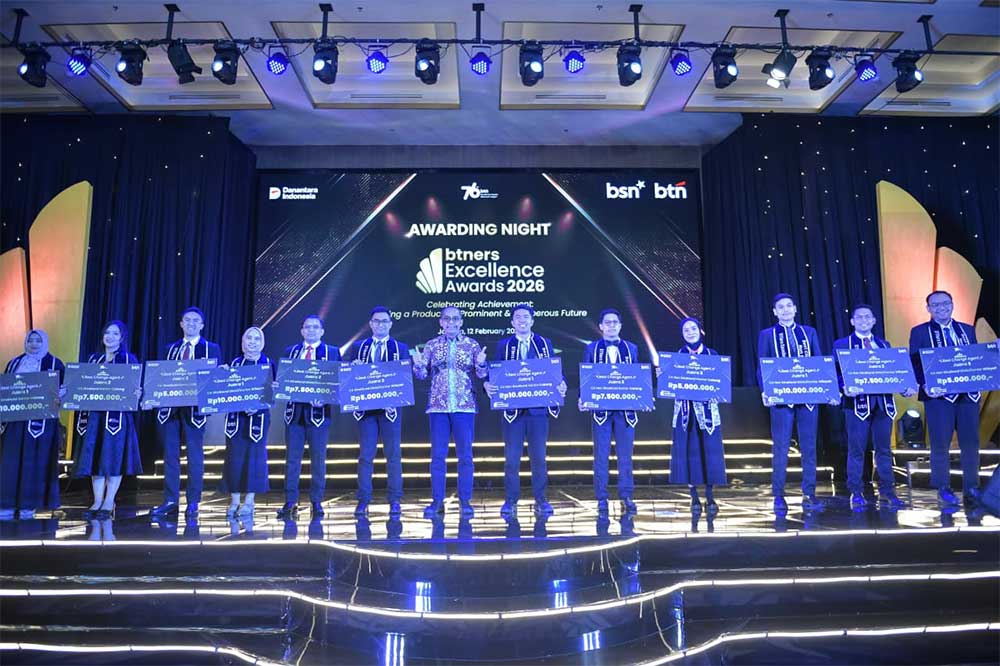 Komisaris Utama PT Bank Tabungan Negara (Persero) Tbk (BTN) Suryo Utomo (tengah) bersama para pemenang BTNers Excellence Award (BXA) dalam malam puncak penghargaan BXA 2026 di The Grand Platinum Hotel Jakarta, Kamis (12/2). BXA 2026 merupakan bentuk apresiasi perusahaan kepada BTNers yang telah bekerja sungguh-sungguh, memberikan hasil terbaik, dan membawa perubahan positif bagi BTN. Penghargaan ini menegaskan bahwa setiap kerja keras, ide baru, dan semangat melayani memiliki arti penting bagi perjalanan BTN ke depan. Di tengah perubahan yang semakin cepat, BTN membutuhkan insan yang terus belajar dan beradaptasi, bekerja dengan semangat dan hasil nyata, serta berani bergerak cepat dan tepat. BTN berkomitmen melangkah menjadi mitra utama keluarga Indonesia melalui layanan yang semakin mudah, modern, dan bermanfaat. BTNers Excellence Award terdiri dari lima kategori, yaitu Best Employee, Best Performance, Best Change Agent, Best Service, dan BTN Star.Foto/RoniMawardi/BUMNTRACK