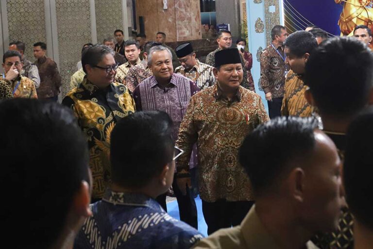 Presiden Republik Indonesia Prabowo Subianto didampingi Gubernur Bank Indonesia (BI) Perry Warjiyo (kiri) saat menghadiri Pertemuan Tahunan Bank Indonesia (PTBI) 2025 dengan tema “Tangguh dan Mandiri : Sinergi Mendorong Pertumbuhan Ekonomi Lebih Tinggi dan Berdaya Tahan” di Jakarta, Jumat (28/11/2025). PTBI 2025 merupakan forum strategis untuk menyampaikan pandangan Bank Indonesia mengenai kondisi perekonomian terkini, tantangan, prospek, dan arah bauran kebijakan Bank Indonesia.Foto/RoniMawardi/BUMNTRACK