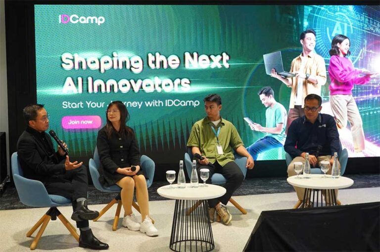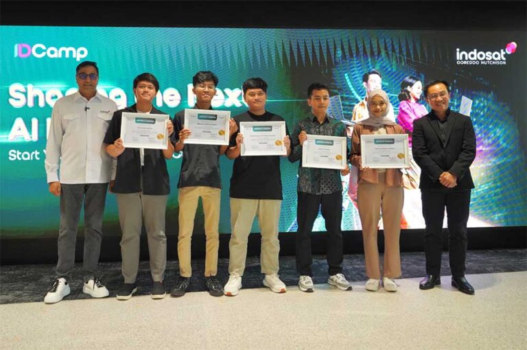 President Director and CEO Indosat Vikram Sinha (tengah) bersama IDCamp Machine Learning Alumni & IDCamp Trainer M. Alif Ramadhan (dari kiri), Google Developer Expert & IDCamp 2025 Curriculum Designer Esther Irawati Setiawan, Chief Human Resources Officer Indosat Irsyad Sahroni, dan Founder & CEO Dicoding Indonesia Narenda Wicaksono dalam peluncuran program IDCamp 2025 di Jakarta, Rabu (24/9/2025).Foto/RoniMawardi/BUMNTRACK