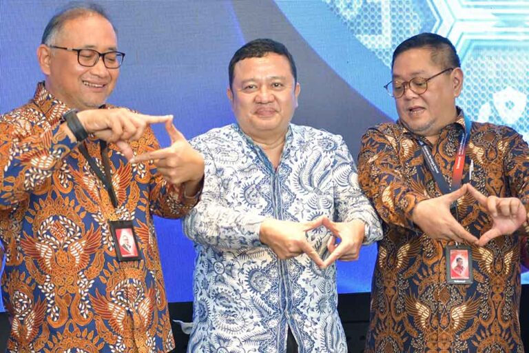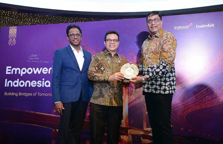 Wakil Menteri KOMDIGI Nezar Patria, (tengah) President & CEO Indosat Vikram Sinha (kanan) dan Founder & CEO Twimbit Manoj Menon saat Launching Event Empowering Indonesia Report 2025 di Jakarta, Senin (27/10). Pemerintah Republik Indonesia menargetkan pertumbuhan ekonomi hingga 8% dan status negara berpenghasilan tinggi pada 2030 sebagai bagian dari visi Asta Cita. Salah satu pendorong utama pencapaian tersebut adalah pemanfaatan kecerdasan artifisial (AI) yang berdaulat. Menyadari hal ini, Indosat bersama Twimbit, perusahaan riset dan konsultasi terkemuka, meluncurkan Empowering Indonesia Report 2025 bertema “Building Bridges of Tomorrow”, yang menegaskan pentingnya sovereign AI atau AI berdaulat sebagai fondasi utama pertumbuhan ekonomi digital Indonesia.Foto/RoniMawardi/BUMNTRACK