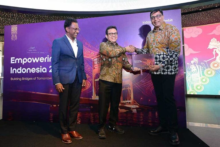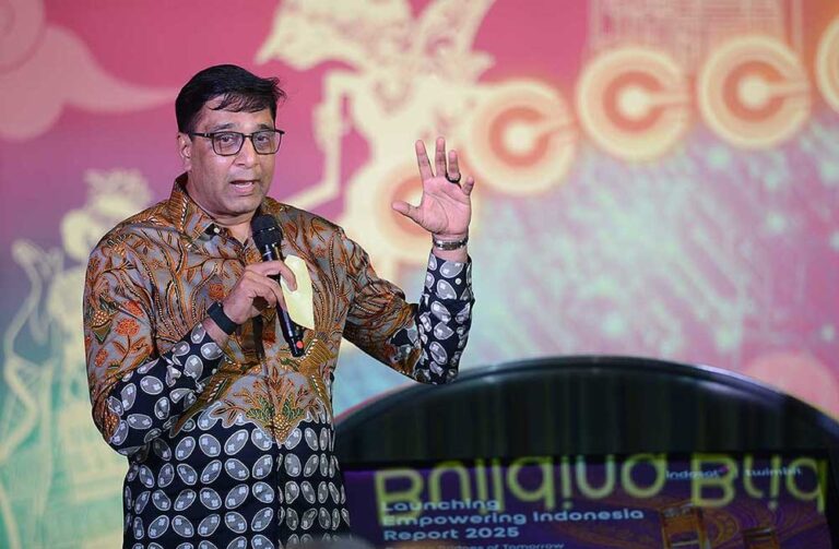 President & CEO Indosat Vikram Sinha saat Launching Event Empowering Indonesia Report 2025 di Jakarta, Senin (27/10). Pemerintah Republik Indonesia menargetkan pertumbuhan ekonomi hingga 8% dan status negara berpenghasilan tinggi pada 2030 sebagai bagian dari visi Asta Cita. Salah satu pendorong utama pencapaian tersebut adalah pemanfaatan kecerdasan artifisial (AI) yang berdaulat. Menyadari hal ini, Indosat bersama Twimbit, perusahaan riset dan konsultasi terkemuka, meluncurkan Empowering Indonesia Report 2025 bertema “Building Bridges of Tomorrow”, yang menegaskan pentingnya sovereign AI atau AI berdaulat sebagai fondasi utama pertumbuhan ekonomi digital Indonesia.Foto/RoniMawardi/BUMNTRACK