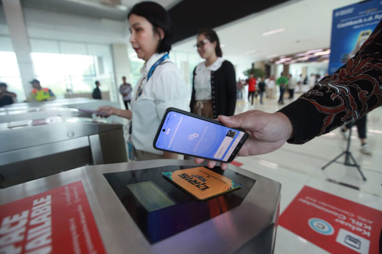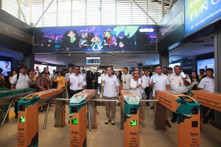 Peresmian implementasi QRIS Tap di transportasi publik di Jakarta, Rabu (19/11). Fitur QRIS Tap memungkinkan pengguna cukup menempelkan ponsel di gate menggunakan teknologi NFC tanpa top-up dan tanpa pemindaian QR manual. Integrasi ini memperkuat kenyamanan mobilitas masyarakat serta keandalan sistem pembayaran digital di ruang publik. Melalui Livin’ by Mandiri, pengguna Android ber-NFC dapat melakukan pembelian tiket layanan KCI, KRL Solo-Yogyakarta, dan LRT Jabodebek dengan lebih praktis. Kolaborasi ini diharapkan meningkatkan kemudahan transaksi nasabah, di mana hingga September 2025 frekuensi transaksi QRIS Livin’ telah mencapai 878 juta dengan nilai Rp123,5 triliun, tumbuh 103 persen secara tahunan.Foto/RoniMawardi/BUMNTRACK