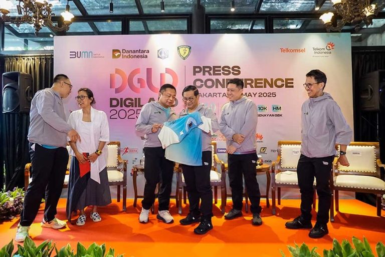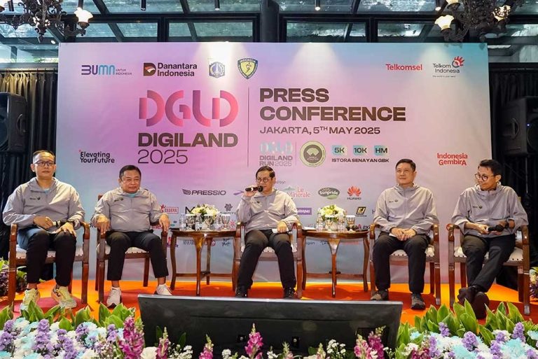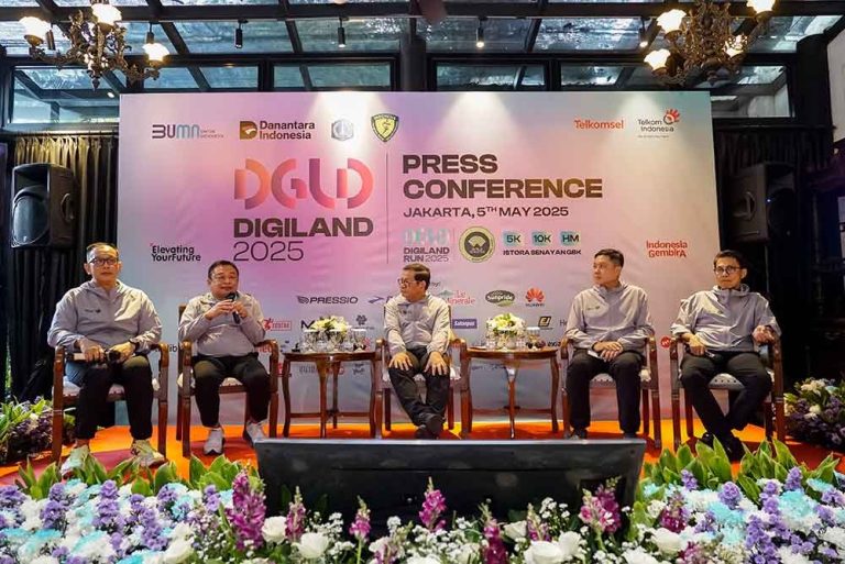 Dirut PT Telkom Indonesia (Persero) Tbk Ririek Adriansyah (kiri) didampingi Direktur Marketing Telkomsel Derrick Heng (kedua kanan), dan Sekjen PB PASI Tigor Tanjung meyerahkan kaos jersey Digiland Run 2025 usai memberikan keterangan pers terkait rencana penyelenggaraan Digiland 2025 Run di Jakarta, Senin (5/5).Digiland Run 2025 sudah mengantongi World Athletics Label Road Races Untuk Kategori 10K dan 21K artinya rekor yang terjadi di ajang ini akan tercatat secara internasional. Selain olahraga, Digiland 2025 yang mengusung semangat “Elevating Your Future”, akan digelar pada 18 Mei 2025 di Istora Senayan, Jakarta, akan dimeriahkan dengan Digiland Music yang menampilkan artis-artis papan atas seperti Sheila on 7, Padi Reborn, King Nassar, Bernadya, Lyodra, JKT 48, D’Masiv, dan Project Pop. Di saat bersamaan, guna peningkatan ekonomi kerakyatan, Digiland 2025 juga menghadirkan beragam kuliner nusantara dan pasar UMKM, sehingga para pelaku usaha dapat turut memasarkan produknya kepada masyarakat.Foto/RoniMawardi/BUMNTRACK