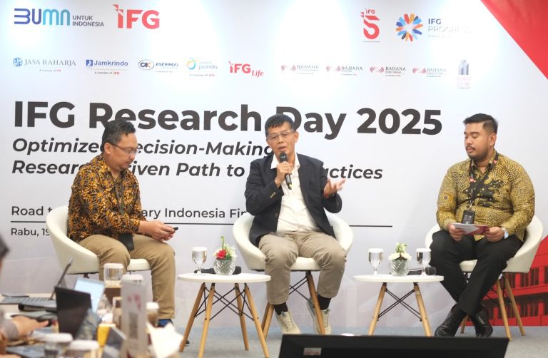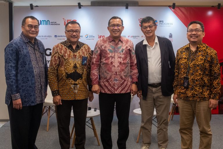 Wakil Direktur Utama Indonesia Financial Group (IFG) Haru Koesmahargyo (tengah) Direktur Operasional Jasindo Ocke Kurniandi (kedua kiri), Sekretaris Perusahaan IFG Denny S. Adji (kiri), Head of Portofolio Analytic PT Bahana TCW Investment Management Indonesia Group Budi Hikmat, dan Head of IFG Progress Ibrahim Kholilul Rohman (kanan), foto bersama disela gelaran “IFG Research Day 2025” yang dijadwalkan berlangsung, di Jakarta, 18 – 20 Februari 2025. Kegiatan ini merupakan salah satu rangkaian perayaan HUT IFG ke 5 tahun yang mengusung tema “Empowering Growth”. “IFG Research Day 2025” merupakan sebuah ajang untuk mendiseminasikan hasil riset dan kajian dari IFG Progress di industry keuangan non bank berbasis data kepada masyarakat luas. IFG Progress merupakan lembaga riset atau thinktank di bawah naungan IFG holding, ingin menyampaikan dan membagi hasil pemikiran progresif kepada masyarakat sehingga berdampak pada kemajuan industri jasa keuangan non bank Indonesia khususnya di industri asuransi, penjaminan dan investasi. Foto/Dok-IFG/BUMNTRACK