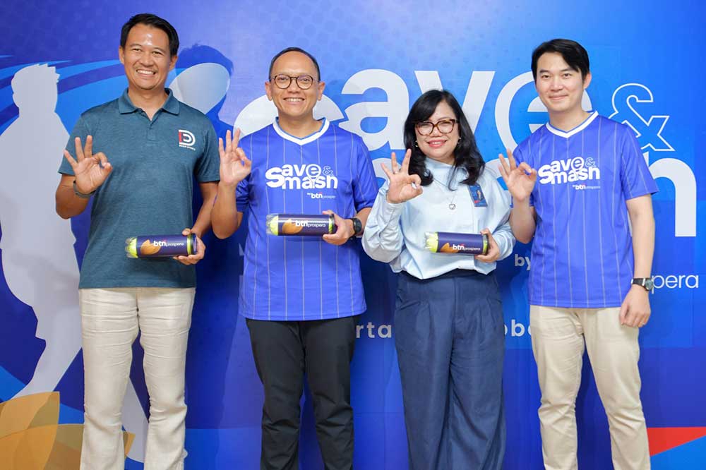 Retail Funding Division Head Frengky Rosadrian (kedua kiri), Regional Office Head Kantor Wilayah Jakarta 1 BTN Elma Hetty (kedua kanan), Department Head Emerging Affluent BTN Mario Sabato (kanan) dan Founder & CEO Dash Sports Alit Aryaguna (kiri) usai peluncuran program BTN Prospera Save & Smash di Athletiqs Airdome Jakarta, Rabu (22/10/2025). Program ini menjadi bagian dari upaya BTN, khususnya bagi nasabah segmen emerging affluent yang menjadi nasabah BTN Prospera, untuk mendorong gaya hidup sehat melalui sinergi antara kesehatan finansial dan aktivitas olahraga padel, dengan memberikan reward akses gratis ke lapangan padel bagi nasabah BTN Prospera yang aktif bertransaksi.Foto/RoniMawardi/BUMNTRACK