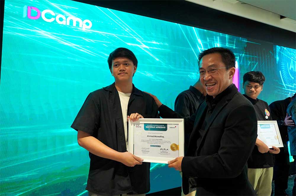 President Director and CEO Indosat Vikram Sinha memberikan lencana kepada peserta lulusan IDCamp 2024 yang telah lulus disela launching IDCamp 2025 di Jakarta, Rabu (24/9/2025).Foto/RoniMawardi/BUMNTRACK