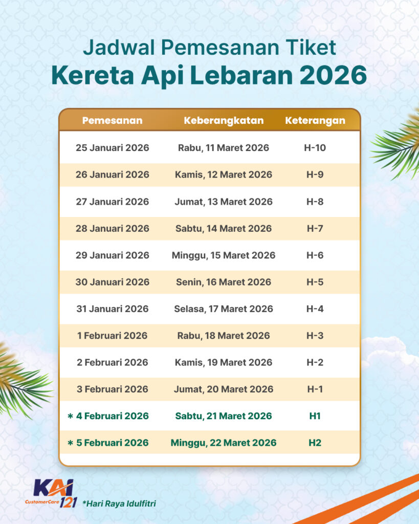 Jakarta, Bumntrack.co.id – Masa Liburan Lebaran 2026 kian mendekat. Melalui skema pemesanan H-45, PT Kereta Api Indonesia (Persero) membuka penjualan tiket kereta api secara bertahap, sehingga masyarakat yang melakukan pemesanan pada 25 Januari 2026 sudah dapat merencanakan perjalanan untuk keberangkatan mulai 11 Maret 2026.