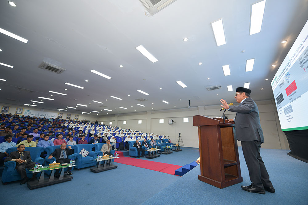 Direktur Utama Bank Syariah Nasional (BSN) Alex Sofjan Noor menyapa para santri usai berfoto bersama dengan Dosen Fakultas Ekonomi Dan Manajemen UNIDA Gontor Royyan Ramdhani Djayusman, Wakil Rektor II Setiawan bin Lahuri, Corporate Secretary BSN Dody Agoeng, Kepala BTN Syariah Solo Toni Ardiansyah saat penyerahan bantuan sosial motor sampah untuk lingkungan pendidikan hijau di sela-sela kuliah umum di Universitas Darusaalam Gontor, Ponorogo, Madiun pada hari Kamis (4/12). Dalam sharing session berjudul Peran Pesantren Dalam Mendukung Transformasi Ekonomi & Perbankan Syariah di Indonesia tercetus gagasan untuk mengajak para santri muda dapat mendukung sosialisasi literasi keuangan syariah di Indonesia dengan pertimbangan pondok pesantren sebagai pusat edukasi dan literasi keuangan syariah, penggerak UMKM syariah, penguat ekonomi halal dan laboratorium syariah. Sebelumnya pada hari yang sama BSN berkunjung ke Pondok Pesantren Gontor dan diterima langsung oleh pimpinan pondok pesantren tersebut KH Hasan Abdullah Sahal.Foto/RoniMawardi/BUMNTRACK