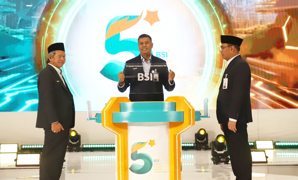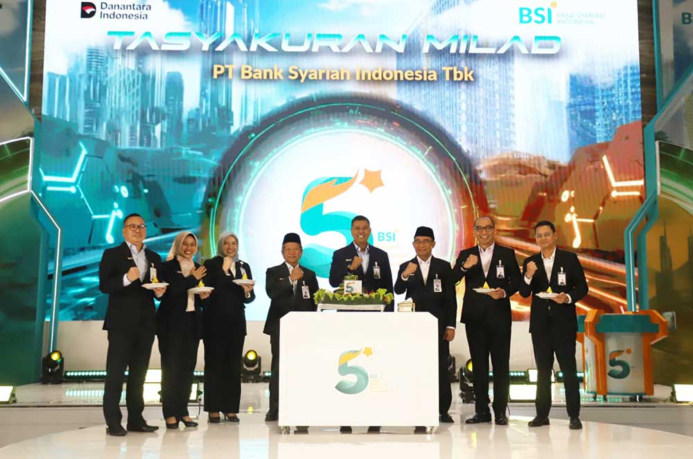 Direktur Utama PT Bank Syariah Indonesia (Persero) Tbk Anggoro Eko Cahyo (tengah), Komisaris Utama Muhadjir Effendy (kanan) dan Ketua Dewan Pengawas Syariah K.H. Hasanudin (kiri) menghadiri acara seremonial Milad BSI Ke-5 di BSI Tower, Jakarta, Senin (2/2/2026). PT Bank Syariah Indonesia (Persero) Tbk (BRIS) atau BSI resmi menyandang nama Persero berdasarkan hasil Rapat Umum Pemegang Saham Luar Biasa (RUPSLB) yang digelar pada (22/12/2025) dan menegaskan diri sebagai bank emas pertama di Indonesia yang menggabungkan perbankan syariah dengan bisnis bank emas (bullion bank) sebagai dua mesin utamaFoto/RoniMawardi/BUMNTRACK