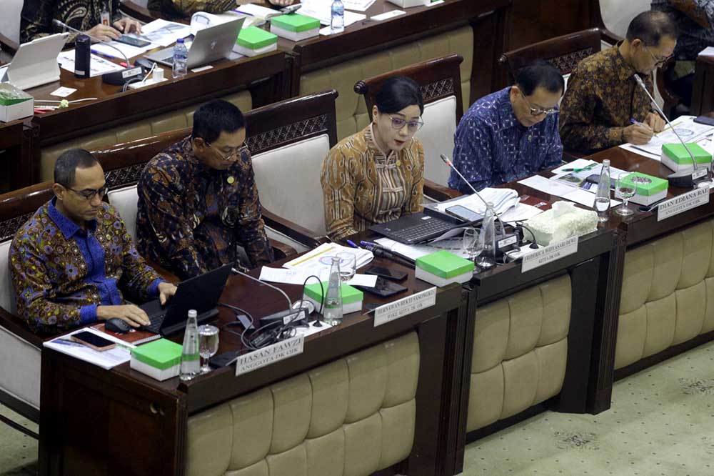 Ketua Dewan Komisioner Otoritas Jasa Keuangan (OJK) Friderica Widyasari Dewi (tengah) bersama Wakil Ketua Dewan Komisioner OJK Hernawan Bekti Sasongko (kedua kiri) anggota Dewan Komisioner OJK Hasan Fauzi (kiri), Dian Ediana Rae (kedua kanan) dan Ogi Prastomiyono (kanan) mengikuti Rapat Kerja (Raker) dengan Komisi XI DPR, Gedung Nusantara I, Kompleks Parlemen Senayan, Jakarta, Rabu (1/4). Rapat ini membahas 8 Program Kerja Prioritas OJK, yang menjadi fokus utama sektor keuangan adalah Makan Bergizi Gratis (MBG), Koperasi Desa dan Kelurahan Merah Putih (KDKMP), serta Program Tiga Juta Rumah.Foto/RoniMawardi/BUMNTRACK