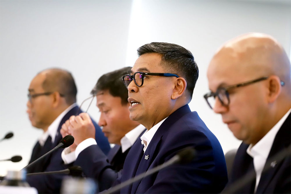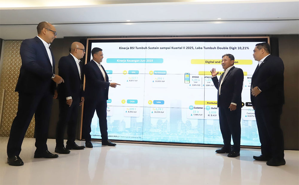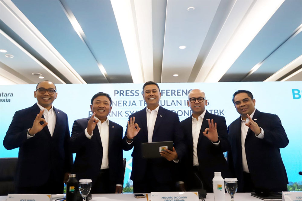 Direktur Utama BSI Anggoro Eko Cahyo (tengah) didampingi Wakil Direktur Utama Bob T Ananta (kedua kiri), Direktur Risk Management Grandhis H Harumansyah (kiri), Direktur Finance & Strategy Ade Cahyo Nugroho (kedua kanan) dan Direktur Sales & Distribution Anton Sukarna (kanan) berfoto bersama sebelum konferensi pers kinerja triwulan II di Kantor Pusat BSI, Jakarta Selatan, Senin (22/9/2025).PT Bank Syariah Indonesia Tbk mencatat kinerja solid pada kuartal II/2025 dengan laba bersih tumbuh 10,21 persen year on year (yoy) menjadi Rp3,74 triliun, ditopang bisnis emas dan haji.Foto/RoniMawardi/BUMNTRACK