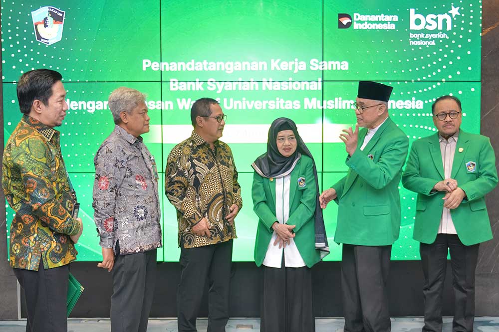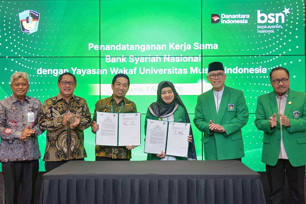 (Dari kiri kekanan) Kepala Cabang BSN Makassar Wahyudi Dahlan, Direktur Consumer Banking BSN Mochamad Yut Penta, Direktur Utama BSN Alex Sofjan Noor, Ketua Pengurus Yayasan Wakaf Universitas Muslim Indonesia Masrurah Mokhtar, Ketua Pembina Yayasan Wakaf Universitas Muslim Indonesia Mansyur Ramly, dan Rektor Universitas Muslim Indonesia Hambali Thalib berfoto bersama saat acara Penandatanganan Kerja Sama BSN dengan Yayasan Wakaf Universitas Muslim Indonesia di Jakarta, Selasa (7/4/2026). BSN menjalin kerja sama strategis dengan Yayasan Wakaf UMI dalam upaya meningkatkan kualitas layanan keuangan syariah, serta mendukung pengelolaan dana yang profesional dan berkelanjutan sebagai bagian dari komitmen memperluas kontribusi perseroan terhadap institusi pendidikan berbasis Islam, sekaligus memperkuat implementasi prinsip keuangan syariah yang transparan, akuntabel, dan berorientasi pada kebermanfaatan. Selain pemanfaatan jasa dan layanan BSN untuk mendukung kegiatan UMI, kerjasama yang ditandatangani kedua belah pihak juga membuka ruang untuk pengembangan bisnis yang berdampak positif bagi ekosistem UMI yang saat ini berfokus untuk mengembangkan bisnis usaha secara syariah. BSN dianggap sebagai mitra bank syariah paling tepat saat ini untuk mendampingi UMI dalam pengelolaan dana dan pengembangannya.Foto/RoniMawardi/BUMNTRACK(Dari kiri kekanan) Kepala Cabang BSN Makassar Wahyudi Dahlan, Direktur Consumer Banking BSN Mochamad Yut Penta, Direktur Utama BSN Alex Sofjan Noor, Ketua Pengurus Yayasan Wakaf Universitas Muslim Indonesia Masrurah Mokhtar, Ketua Pembina Yayasan Wakaf Universitas Muslim Indonesia Mansyur Ramly, dan Rektor Universitas Muslim Indonesia Hambali Thalib berfoto bersama saat acara Penandatanganan Kerja Sama BSN dengan Yayasan Wakaf Universitas Muslim Indonesia di Jakarta, Selasa (7/4/2026). BSN menjalin kerja sama strategis dengan Yayasan Wakaf UMI dalam upaya meningkatkan kualitas layanan keuangan syariah, serta mendukung pengelolaan dana yang profesional dan berkelanjutan sebagai bagian dari komitmen memperluas kontribusi perseroan terhadap institusi pendidikan berbasis Islam, sekaligus memperkuat implementasi prinsip keuangan syariah yang transparan, akuntabel, dan berorientasi pada kebermanfaatan. Selain pemanfaatan jasa dan layanan BSN untuk mendukung kegiatan UMI, kerjasama yang ditandatangani kedua belah pihak juga membuka ruang untuk pengembangan bisnis yang berdampak positif bagi ekosistem UMI yang saat ini berfokus untuk mengembangkan bisnis usaha secara syariah. BSN dianggap sebagai mitra bank syariah paling tepat saat ini untuk mendampingi UMI dalam pengelolaan dana dan pengembangannya.Foto/RoniMawardi/BUMNTRACK(Dari kiri kekanan) Kepala Cabang BSN Makassar Wahyudi Dahlan, Direktur Consumer Banking BSN Mochamad Yut Penta, Direktur Utama BSN Alex Sofjan Noor, Ketua Pengurus Yayasan Wakaf Universitas Muslim Indonesia Masrurah Mokhtar, Ketua Pembina Yayasan Wakaf Universitas Muslim Indonesia Mansyur Ramly, dan Rektor Universitas Muslim Indonesia Hambali Thalib berfoto bersama saat acara Penandatanganan Kerja Sama BSN dengan Yayasan Wakaf Universitas Muslim Indonesia di Jakarta, Selasa (7/4/2026). BSN menjalin kerja sama strategis dengan Yayasan Wakaf UMI dalam upaya meningkatkan kualitas layanan keuangan syariah, serta mendukung pengelolaan dana yang profesional dan berkelanjutan sebagai bagian dari komitmen memperluas kontribusi perseroan terhadap institusi pendidikan berbasis Islam, sekaligus memperkuat implementasi prinsip keuangan syariah yang transparan, akuntabel, dan berorientasi pada kebermanfaatan. Selain pemanfaatan jasa dan layanan BSN untuk mendukung kegiatan UMI, kerjasama yang ditandatangani kedua belah pihak juga membuka ruang untuk pengembangan bisnis yang berdampak positif bagi ekosistem UMI yang saat ini berfokus untuk mengembangkan bisnis usaha secara syariah. BSN dianggap sebagai mitra bank syariah paling tepat saat ini untuk mendampingi UMI dalam pengelolaan dana dan pengembangannya.Foto/RoniMawardi/BUMNTRACK