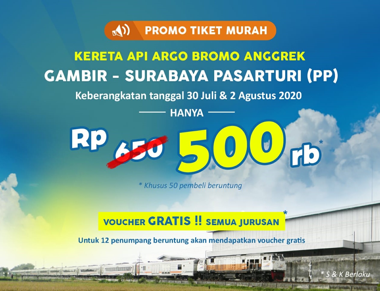 Potongan harga ini tersedia untuk 50 pelanggan yang beruntung yang membeli tiket KA Argo Bromo Anggrek perjalanan 30 Juli dan 2 Agustus 2020 melalui aplikasi KAI Access, Website kai.id, dan seluruh mitra resmi penjualan tiket KAI lainnya.