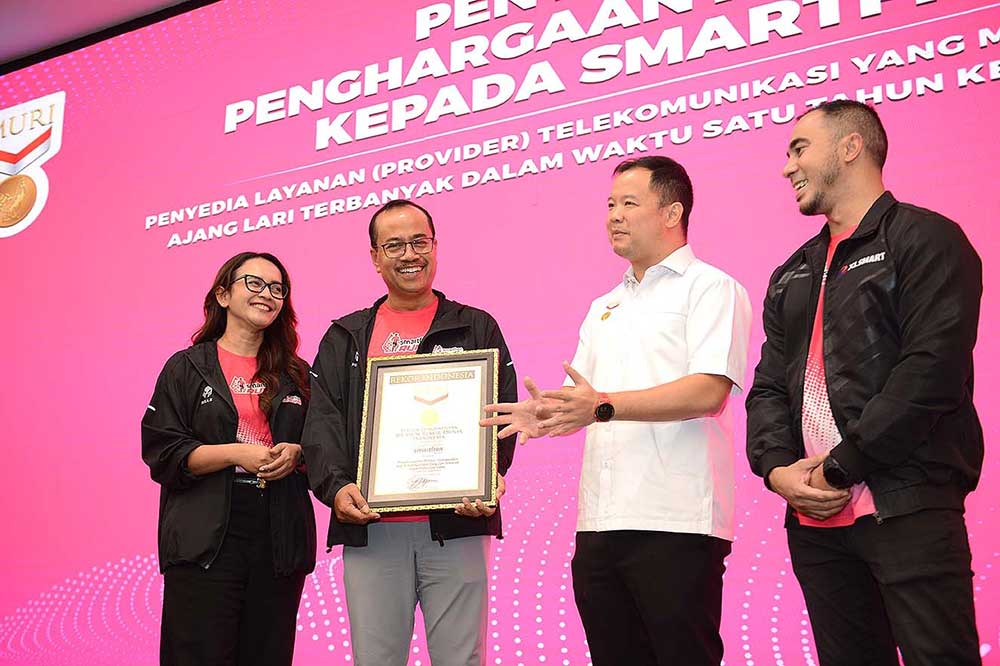 SMARTFREN berhasil mencatatkan rekor nasional sebagai “Penyedia Layanan Telekomunikasi yang Menyelenggarakan Ajang Lari Terbanyak dalam Waktu Satu Tahun” melalui program Smartfren Fun Run 2025. Dalam kurun satu tahun, Smartfren sukses menggelar rangkaian kegiatan fun run di 22 kota di seluruh Indonesia, menjangkau lebih dari 15 ribu peserta dari berbagai usia dan latar belakang. Penyerahan penghargaan dilakukan di kantor XLSMART Tower, Jakarta oleh Wakil Direktur Utama MURI, Osman Semesta Susilo dan diterima oleh Chief Marketing Officer SMARTFREN XLSMART, Sukaca Purwokardjono. Senin (3/11).Foto/RoniMawardi/BUMNTRACK